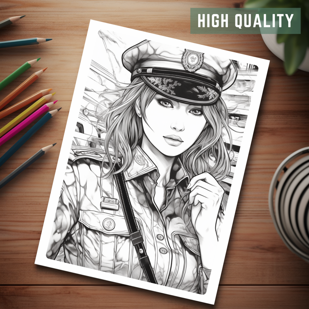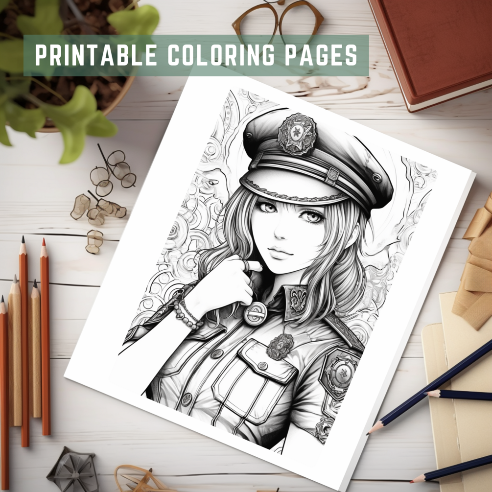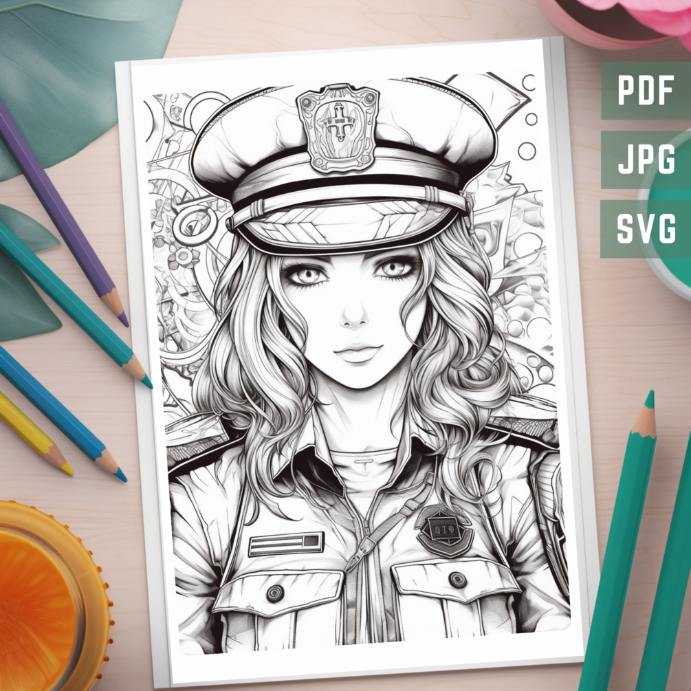Anime Police Girl Coloring Book Page Manga Policewoman Printable Tinting Sheet For Adult Mind Relaxation Activity Lady Cop Painting Sketch